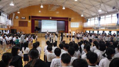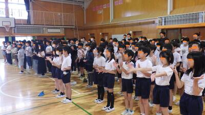 6月4日(水)体育朝会(プール開き)を体育館で行いました。